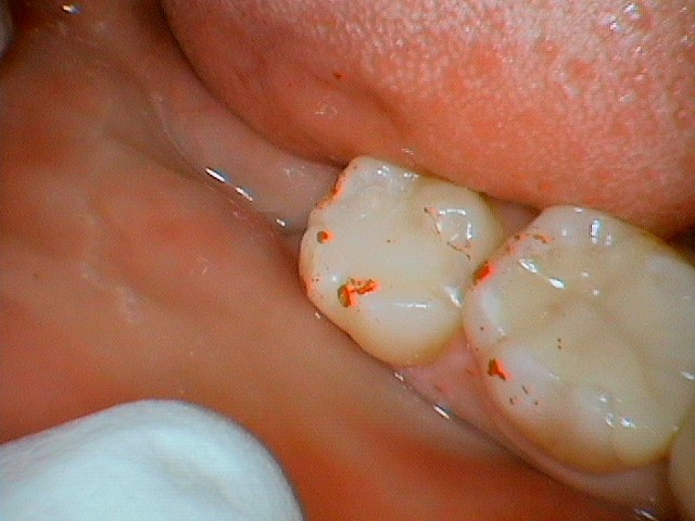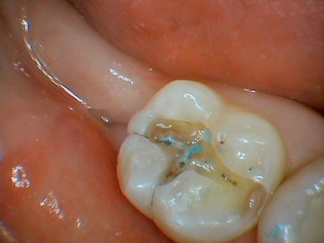この写真では、もう青く染まっている部分がないのがお分かりいただけると思います。これで、虫歯は全て除去完了です!