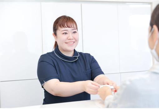 患者さまの受付や案内や電話、業者対応を行い、診療中は医師・衛生士の補助を担当。